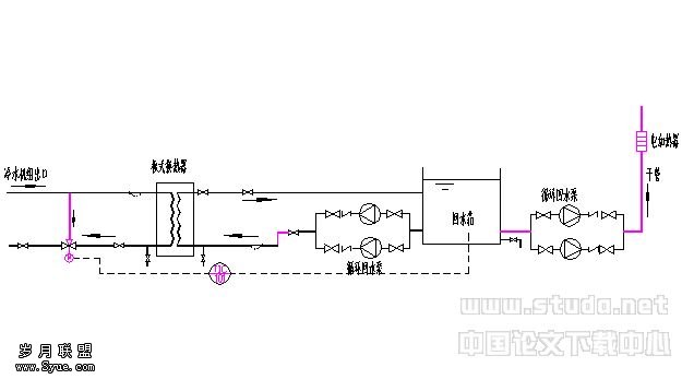 冷水机组自带一套控制系统,根据循环水温的设定值自动启停风冷机组,冷水机组出口水温波动±2℃之间。在板式换热器一次侧设电动三通阀,根据循环水箱温度调节电动三通阀开度使循环水箱温度控制在设定值±1℃的范围内。
