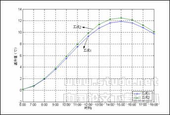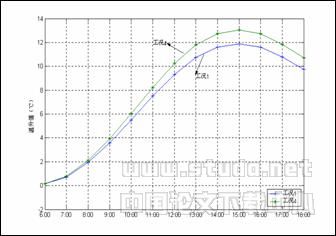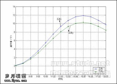 根据编制的程序对4种工况模拟,计算的结果得到了白天6:00至18:00太阳辐射引起的温升大小。基准温度取7月21日的平均温度,为26.36℃。总体看来,其增长幅度情况是符合空气温度变化趋势的。