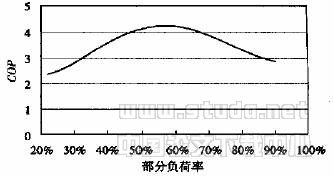 空调机组的制热节能性可以采用机组性能系数COP来描述。本文给出了当室内温度为20℃,室外温度为4℃时,机组能效比与部分负荷的关系曲线,如图12所示: