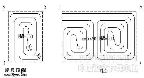 命令1:“ff” 主要绘图命令(见图一)。按顺序在屏幕上点取三个点1,2,3。其中点1,3决定了矩形区域的范围,点2决定地盘管绕动方向。最后输入管间距,即可完成此区域的地盘管绘制。