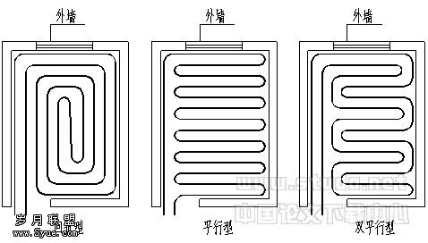 现在常用的地盘管布置方式有以下几种:回折型,平行型,双平行型。如下图: