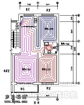 大家可以看出利用此款专业软件可以非常方便得画出地盘管图来。设计人员所需考虑的问题仅限于餐厅的管道布置,利用餐厅来调整三个环路的管长,其它各个房间完全由软件来生成。另外,此软件会在绘图区域中央给出“间距=250”字样,如果在施工说明中指出“所有管道距墙100mm,外圈管道弯曲半径250mm,中心管道弯曲半径150mm”,则不用再进行尺寸标注。