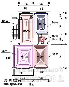 近几年兴起地盘管供暖方式由于具有舒适、卫生、节能、不影响室内感官和不占用室内面积与空间等显著优点,越来越多的被广大用户和设计人员认可,在新建项目中纷纷要求采用地盘管供暖方式。由于地盘管供暖系统施工图的绘制比较烦琐,因此,许多设单位在作具体工程设计时,仅给出房间的耗热量,而注明“由专业施工单位现场布置管道”。这种过于简化的设计方法,不仅使系统管道布置的随意性增大,无法对工程质量进行有效的控制,最终造成施工满足不了设计要求,因此,在2004年10月1日实施的中华人民共和国行业标准《地面辐射供暖技术规程》JGJ 142-2002(以下简称《技术规程》)中明确指出地盘管施工图设计的内容和深度,其中就包括“加热管平面布置图”。