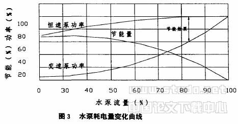可由建筑物的实测得到热负载变化率的情况。这样,就可以决定水泵流量和压力的最大(100%)设计负载,这样相比,一年中负载率在50%以下的时间占全部运行时间的50%以上,一般冷冻水设计温差为5~7℃,冷却水的设计温差为4~6℃,在系统流量固定的情况下,全年绝大部分运行时间温差仅为1~3℃,即在温差低、流量大的情况下工作,增加了管路系统的能量损失,浪费了水泵运行的输送能量。一般空调水泵的耗电量占空调系统耗电的20~30%。因此,节约水泵在低负载时系统供水输出能量具有很重要的意义,所以随负荷而改变水流量的空调水泵系统就显示出巨大的优越性,而得到越来越广泛的重视及应用。采用变频器调节泵的转速可以很方便地调节水的流量其节能率通常可达35%~50%左右。例如水泵的运行特性如下: