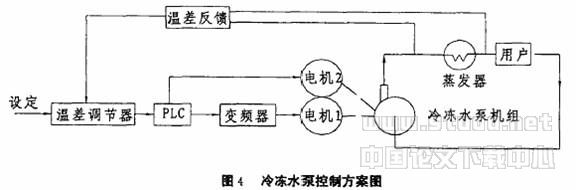 它的水温取决于蒸发器的设定值,回水温度取决于蒸发器接收的热量,中央空调冷冻水出的温度与冷冻水的回水温度设计最大温差为5"C(出水为8"C,回水为13"C)。现采用在蒸发器的出水管和回水管上装有检测温度的变送器。再与PID温度调节器、PLC和变频器组成闭环控制系统,通过冷冻水的温差来控制,使冷冻水泵机组的转速相应于热负载的变化而变化,当第一台电机已达到工频时,还达不到要求时就可起动第二台电机,工频运行,然后调控第一台电机。这样不断调整控制,使其达到最佳的效果。