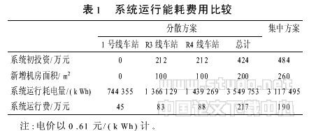 由表1可得出,初投资方面,徐家汇站采用集中制冷站比各新建站分别设置制冷机房增加投资60万元,机房面积增加60m2,如果考虑1号线既有系统的造价,集中制冷站方案的初投资会低于分散方案;运行能耗费用方面,采用集中制冷站,系统每年可节电43.2万kWh,年节约运行费用27万元,经济效益显著,并且运营管理与维护人员相对减少,设备维护集中方便,可进一步节约运营管理与维护费用;社会效益方面,可以取消大量分散的冷却塔及膨胀水箱,减少噪声污染,优化环境。