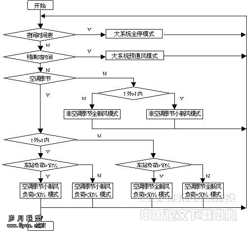大系统正常工艺模式的自动判定执行主要依据如下条件:①依据室外温度判定大系统执行空调或非空调季节模式②依据车站内外空气焓值的比较判定全新风或小新风模式 ③依据车站负荷情况判定执行负荷大于50%模式或小于50%模式 4)依据时间判定夜间或白天模式。图4为正常运行自动模式判断执行流程。