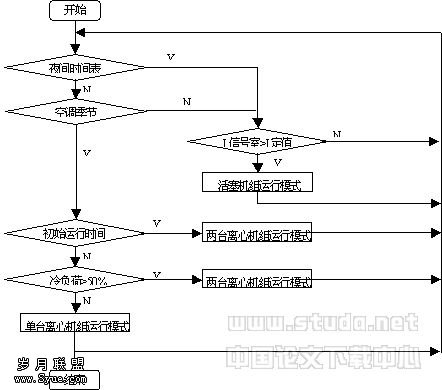BAS系统负责对车站三台冷水机组进行群控。当由BAS系统自动控制冷水系统时,根据以下原则选定水系统正常运行工艺模式:①依据时间表判定白天或夜间模式运行 ②依据室外焓值判定水系统是否进入空调季节运行 ③依据车站冷负荷判定开机数量。下图为车站水系统工况判定流程图: