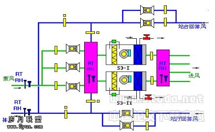 (2) 车站大通风空调系统:BAS系统对空调机、新风机、回排风机及联动风阀和调节风阀等设备进行监视控制,监视风机过载故障报警信号,检测新/排/混/送风及站厅/台温湿度,控制组合风柜出水二通阀开度来调节空调器送风温度,共计DO 44点、DI 72点,AI 30点、AO 4点