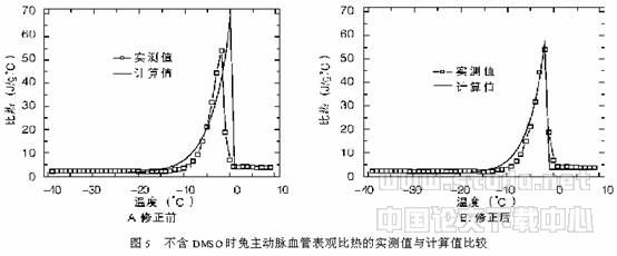 其中,wu—结合水含量,g/g水;Tp—熔融峰温,℃;其它字母同(4)式中的表达意义。用式(5)计算兔主动脉血管在相变区间表观比热值与实测值比较如图5(B)所示,很显然,修正后计算得到的表观比热值能与实测值较好地吻合。