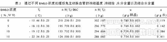 表2中“水分含量”一栏是通过真空干燥后计算得到的。可以看出,相同预处理后的兔主动脉血管经真空干燥后,DMSO浓度越高,其中的水分含量越低,但冻结过程中的结合水含量反而更大。这说明DMSO浓度越高,干燥脱水后的主动脉血管中剩余结合水含量越高,正好可以解释图4中真空干燥后血管的表观比热无论在常温区还是低温区都是随DMSO浓度增加而变大。