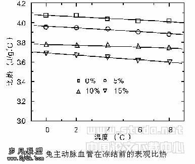 血管移植是血管与心脏修补的良好方法,但由于新鲜供体不足,应用受到很大限制。为提高有限供体的利用率,血管组织的低温保存成为人们近年来研究的重要课题[1]。在研究生物组织、食品材料的低温保存过程中,同其它热物性参数一样,比热是冷冻医疗、食品冻藏装置设计的基本参数,也是理论分析其冻结过程中热应力必不可少的参数。由于缺乏完整的(特别是相变区间)热物性参数,在理论分析生物组织冻结过程时,常常假定冻结前、后的比热为某一常数,而忽略了相变区间表观比热的影响[2~5],这必然增大理论与实际情况之间的误差。