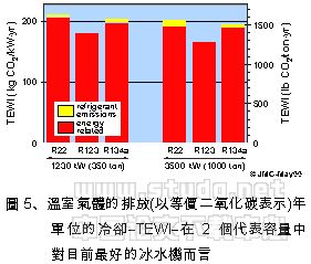 图5比较了用最好的冰水机按照冷媒分类的TEWIs值。它也包含了冷却塔及冷却水帮浦能源消耗。它是以4的方法及及较早的提及的研究资料为基础。使用的GWP值是从最近的国际评估资料中攫取出来。就如同所示,淘汰用于效率最好的冰水机中之R-123将会提高净全球暖化影响达14-20%。