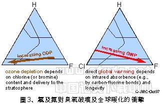 增加氟或氯的成份会增加在大气中的稳定性,将延长其大气存活寿命。就如图3所示,增加冷媒分子中氯的成分通常会提高臭氧破坏之能力(ozone depletion potential) (ODP)。