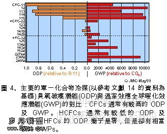 图4对照主要单一化合物冷媒的ODPs值及GWPs值。它建议几点值得注意的事项。