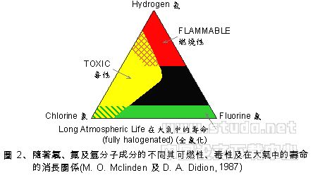 图2表示出有机卤化物的分子间之消长关系,特别是碳化合物与包含氯、氟及氢原子间之关系。增加氢的成分将会缩减其在大气中的寿命,但是却使物质具备可燃性。增加氟的成分将会减少可溶混性,至完全氟化时冷媒通常需要合成的润滑剂以回油。增加氯的成分通常会增加其毒性。然而,许多毒性的形式是如致命的、刺激心脏的、致癌的及导致遗传因子突变,以及麻醉的、影响生殖的及呼吸的效果等。一些毒性是本质上就实际存在的而其它的则是因为化学变化;氯的成份只许多决定性变量其中之一。