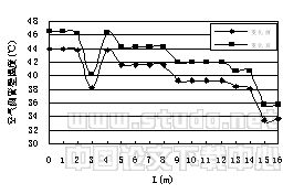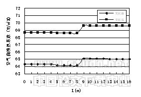 图9至图10分别为夏季工况下,空气侧换热器在采用变化前后的结构参数,空气侧换热系数、管壁温度沿管长的变化。可以看出,变化后的空气侧换热系数明显增大,空气侧管壁温度提高。这是因为随着翅片间距的增大,使流过换热器的空气产生扰动变化,空气侧换热能力增强,冷凝热量迅速传递给空气,降低了空气与管壁的温差。