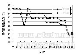 图11至图12分别为空气侧换热器结构参数在变化前后空气侧换热系数、空气侧管壁温度沿管长的变化。可以看出,变化后的空气侧换热系数明显增大,空气侧管壁温度提高。