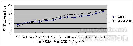 管间距为25mm,管数为200根,管径为20mm。实验工况条件:一次空气和二次空气均采用室外新风,喷水量为201m3/h。计算值与实际值如图4所示,从图上可以清楚的看到,随着ms的增大,间接蒸发冷却器的冷却效率是增加的,在图像上为其渐近线,并且从图上可以看出二、一次风量比的最佳值为0.6~0.8之间,当ms/mp>0.8,二次空气的流量持续增大时,效率增加趋于缓慢。从图形的变化趋势来说,除了在较低的流量比处有两点实测值与理论计算值有误差外,两条曲线的走势基本吻合,在各点的变化趋势中也是一致的。从图上还可以看到,除了个别点外(可以归结为测量误差造成的),实测值与理论计算值吻合的较好。
