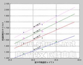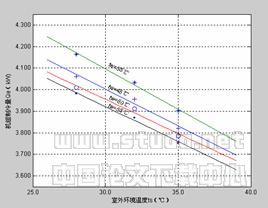 图7为维持室内环境温度为25℃,并维持一定的蒸发压力(本实验蒸发压力维持在0.397MPa)下,机组的耗功随室外环境温度变化的关系曲线图。从图7中可以看出: