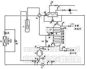 5-容积式水加热器;6-四通换向阀;7-汽液分离器;