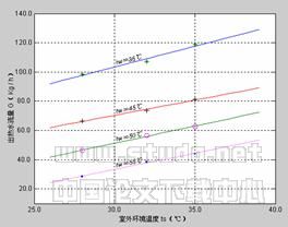 图3给出了维持室内环境温度为25℃,并维持一定的蒸发压力下(本实验蒸发压力维持在0.397MPa),在不同的热水出水温度下,热水供应量随室外环境温度变化的关系曲线图。从图3中可以看出: