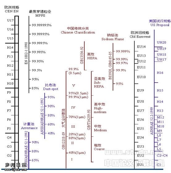 当使用“G~F~H~U”效率规格分类时,可方便地估计所需各级过滤器的效率。在G2~H12中,每隔2~4档设置一级过滤器。例如:G4→F7→H10,其中,末端H10(亚高效)过滤器决定送风的洁净水平,F7保护H10,G4保护F7。