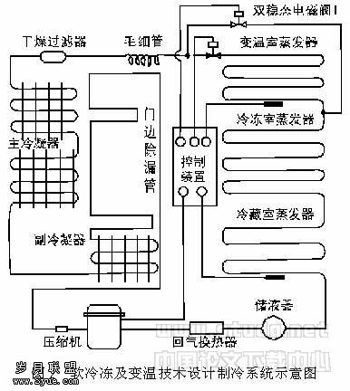 3.4 防凝露管节能设计:从压缩机排气管至干燥过滤器出口整个高压区域皆为冷凝器负荷对应区域,包括制冷剂蒸汽的冷却、冷凝及再冷(过冷)三个过程,对应设备包括付冷凝器、主冷凝器及门边防露管。由于排气温度的不同,采用不同制冷剂时管路布置也不相同。项目研制中采用制冷剂R600a,由于采用R600a使压缩机排气温度降低,约55℃左右,故将压缩机排出的高压气体先进门边防露管,再进主、副冷凝器,这样即使条件变化,门边防露管末端对应温度也高于最高环境温度,既可保证加热门框、提高防露效果,同时,在管路布置时尽量使防露管远离箱体内腔,又可减小热量向箱内传递,实现节能之目的,系统图如图2示。