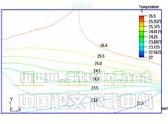 [8] 通过CFD方法对一个6m×4m×3m的办公室进行了模拟,房间负荷50W/m2,送风温度22℃,模拟结果如图3。可以看出,适当增大送风速率,室内垂直温度梯度明显减小,有助于提高热舒适性。