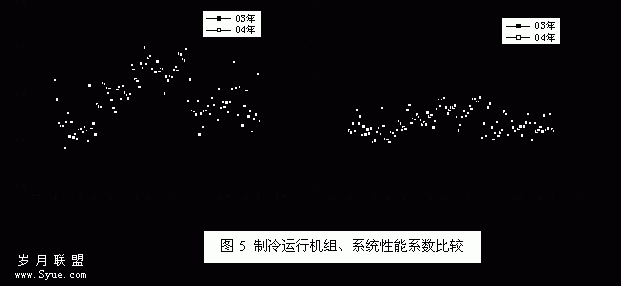 2003年机组COP较2004年低,但系统COP较2004年高。究其原因,2003年两台机组共同承担制冷负荷,但每台机组均不是工作在额定负荷下,导致机组效率下降。由于地下环路以及用户末端环路采用定流量循环,因此,在循环水泵功率不变情况下,实际运行负荷相对较小的2004年系统性能较低一些。