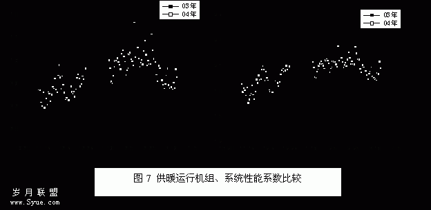 从图6看出,两季供暖运行均表明,埋管换热能力大体随着运行时间的增加而减弱。 2004年实际室内供热负荷较2003年大,因此在运行时间相差不多的情况下,2004年从地下取热量大于2003年。