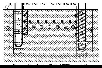数据实时监控和采集系统(SCADA)包括测温部件铜—康铜铠装热电偶、流量传送器、功率变送器、PLC下位机、组态王软件和PC上位机。地源热泵系统实验测试的对象如下:地下不同深度上的土壤温度(见图2),桩埋、井埋进出口水温、流量,以及机组和水泵等功率。