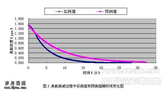 当室内臭氧的含量达到稳定值时,关闭臭氧发生器时,此时被测房间的臭氧浓度为1.537~1.545ppm(3.07mg/m3),也就是衰减时的初始浓度。打开通风系统,通入的新风的臭氧浓度为0.014ppm(0.028 mg/m3)。通过对浓度上升时的数据进行回归,得到臭氧在本空调系统中的衰减系数Kd的值为0.126 1/h,再利用一阶模型和公式(3)可预测室内臭氧随时间衰减的浓度,因此洁净室在臭氧消毒后,臭氧进入衰减期浓度的预测值和实测值关系如下图3所示: