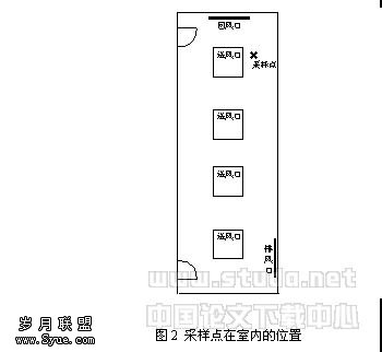 室内臭氧浓度采样点的具体位置如图2所示,位置位于空调系统中的一间污染物有严格要求的洁净室内,该洁净室的尺寸为2.2×9.0×2.6m3,共有4个送风口,一个回风口,一个排风口,两扇向内开启的门(在测试期间关闭);采样点的高度1.5m。