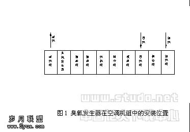 本次测试的臭氧消毒的生物洁净室所采用的高浓度臭氧,是通过臭氧发生器产生的。臭氧发生器安装的具体位置通常有三种:安装在空调系统的送风道中;安装在空调系统的回风道中;安装在空调机组内。该制药公司消毒系统的臭氧发生器安装在空调机组内,具体的位置如图1 所示。所选臭氧发生器是一台康尔公司生产的内置式臭氧发生器(型号KCF-G60),发生量为60±6g/h。由于臭氧本身的衰减和室内的温度、湿度有密切关系,因此在打开臭氧发生器之前,要相应的关闭空调系统的加湿,加热段。为了使臭氧在空调系统中形成内循环,应关闭新风和排风,开机1~2小时后,关闭臭氧发生器;打开通风系统,以保证臭氧浓度可以在规定时间内降到标准允许值。