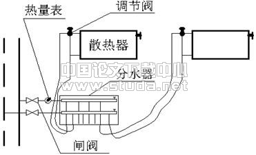图6为此系统的原理图,做法是在每户设置一分水器,供水进入分水器后分出若干并联的支管,末端连接至散热器,再经回水集中到集水器。在制作安装时应将管线埋地敷设(一般采用聚丁烯管或PB管),要防止地面因热应力造成龟裂和破损,要妥善处理好管道热膨胀时产生的推力传递给地板。该方案的优点是:可分室控制温度,调节性能优于单管系统;管线埋地敷设,墙面竖向无立管,不影响墙面、地面装修;缺点是:管线埋地须设隔热措施,造价偏高;每组散热器须设冷风阀。