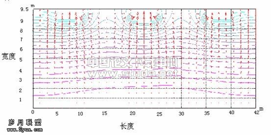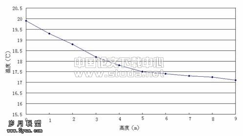机库内8米高处有钢网吊顶,考虑到飞机检修高度,将辐射采暖器用吊架悬挂安装于吊顶下7.5米高处,符合燃气红外线辐射器安装高度不应低于3米的规定。燃气红外线辐射器用于全面采暖时,建筑维护结构的耗热量可不计算高度附加,并在此基础上乘以0.8-0.9的修正系数[2],此处取0.8,根据使用手册,系统安装高度超过6米时,每增高0.3米,系统的设计热负荷需增加1%,所以高度修正系数为1.05,计算得机库实际采暖热负荷为220Kw,选用六套辐射采暖器(平面布置见图3),每套功率35Kw. 采暖通风与空气调节设计规范[2]规定燃气红外线辐射采暖系统的尾气应排至室外,排风口应设在人员不经常通行的地方,距地面高度不低于2.0米且伸出墙面不少于0.5米,所以燃烧废气就近由接管穿墙排至室外即符合要求。该系统安装使用后,机库内温度分布得到明显改善。为了同原有的对流供热方式做一个对比,作者采集了两种供热方式库房内工作区域相同高度的温度,模拟出不同高度的温度分布曲线,如图4是对流供热不同高度温度分布曲线,如图5为是燃气红外线辐射供热方式的分布曲线。为了验证采用红外辐射供暖后库房内温度分布的均匀性,作者采集了工作区域的某一端面的温度,用计算机模拟出该端面的温度场分布图,图6是该横截面的温度分布图,图中曲线是该横截面的上的温度场分布,箭头所指的方向是等温线逐渐增大的方向。从图可看到该区域温度分布均匀,从实际运用来看部队反映效果良好。达到了预期的目的。