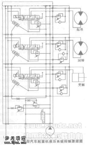 图3所示为某型汽车起重机的液压系统简图,图中仅画出了与电液比例阀有关的部分。该机采用了3片TECNORD TDV-4/3 LM-LS/PC型比例多路阀,负载传感油路中的3个梭阀将3个工作负载中的最大压力选出来送至远程调压溢流阀的远控口,调整溢流阀的溢流压力,使液压泵的输出压力恰好符合系统负载的需要即可,从而达到一定的节能目的。压力补偿油路使得通过每一片阀的流量仅与该阀的开度有关,而与其所承受的负载无关,与其它阀片所承受的负载也没有关系,从而达到在任一负载下均可随意控制负载速度的目的。