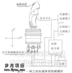 电液比例阀和其它专用器件的技术进步使工程车辆挡位、转向、制动和工作装置等各种系统的电气控制成为现实。对于一般需要位移输出的机构可采用类似于图1的比例伺服控制手动多路阀驱动器完成。电气操作具有响应快、布线灵活、可实现集成控制和与计算机接口容易等优点,所以工程机械液压阀已越来越多地采用电控先导控制的电液比例阀(或电液开关阀)代替手动直接操作或液压先导控制的多路阀。采用电液比例阀(或电液开关阀)的另一个显著优点是在工程车辆上可以大大减少操作手柄的个数,这不但使驾驶室布置简洁,而且能够有效降低操作复杂性,对提高作业质量和效率都具有重要的实际意义。图2是TECNORD公司JMF型控制摇杆(joystick),利用一个摇杆就可以对如图2中的多片电液比例阀和开关阀进行有效控制。该摇杆在X轴和Y轴方向都可以实现比例控制或开关控制,应用十分方便。