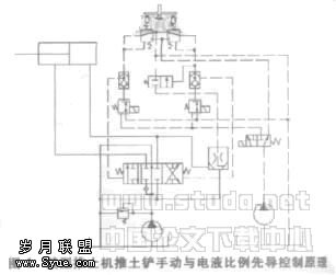 图4 是某推土机推土铲手动与电液比例先导控制实例。当二位三通电磁阀不通电时,先导压力与手动减压式先导阀相通,梭阀选择来自手动先导阀的压力对液动换向阀进行控制;当二位三通电磁阀通电时,先导控制压力油通向三通比例减压式先导阀,通过梭阀对液动换向阀进行控制。