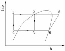 图1为试验的原理图。图中,实验台的理论循环为1 - 2 - 3 - 4 -1 ,实际制冷系统循环为6 - 5 - 2 - 3 - 6。其中,4→1 为制冷剂在磁力泵中压力升高的过程;1 →2为低压换热器中加热升温过程;2 →3 为节流过程;3 →4 为高压换热器中冷凝放热过程;6 →5 为制冷循环中压缩机压缩过程;5 →2 为制冷循环中冷凝放热过程;2 →3 为节流过程;3 →6 为制冷循环蒸发器中蒸发过程。