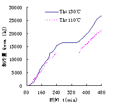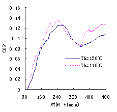 从图6和图7中可以看出,在130℃较高的热源温度时,系统解吸出来的制冷剂氨比110℃的热源温度条件下要多,其制冷量表现为较大。但由于较高的热源温度所消耗的加热量相应的增大较快,所以最终系统的COP表现为较小。因此,我们可以这样认为,热源温度的提高有利于提高系统的制冷量,但对COP来说,理论上存在一个最佳的热源温度范围。