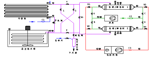 20世纪70年代以来,随着常规能源消耗的剧增、环境污染的加剧,人们对能源的节约和环境的保护引起广泛的关注。其中,固体吸附制冷技术因其无大气污染、能利用低品位热源等优点迎合了这种节能和环保的趋势,并且引起国内外学者的广泛兴趣。从目前国内外对吸附制冷研究的现状来看,对吸附制冷的研究主要集中在工质对的选择及其性能的分析[1]、高效吸附式热力系统的研究以及吸附床内传热传质的研究[2] [3]等几个方面。国内外学者在化学吸附制冷方面也进行了相关的研究工作[4-7],但其实验装置大多采用间歇式制冷的方式。本文建立了一套以氯化钙-氨为工质对的两床连续循环吸附制冷系统,并对其制冷性能进行了初步实验研究,为进一步的理论研究和工程设计提供了依据。