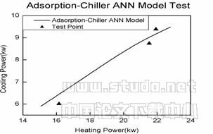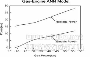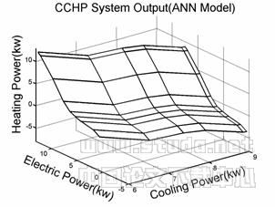 图6是神经模型对系统冷热电同时输出的仿真,从图中可以看出,在发电量一定时,也就是系统输入能量一定时,随着制冷量的增加,系统输出的热量增加,这是由于发电量对应了一定的总的余热回收量,制冷量的增加使得用于吸附机的热量增大,因而使得剩余的输出热量减少。在制冷量一定时,随着发电量的增加,系统的输入能量随之增加,从而使得总的余热回收量增加,制冷量不变对应的吸附机输入热量不变,使得剩余的输出热量增加。上述的仿真结果是与实际的系统相符合的。