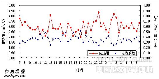 当屋顶外表面温度、内表面温度和热流量已知时,该屋顶瞬时的传热阻和传热系数则可通过方程(4)和方程(5)计算得到,其具体结果如图3所示。