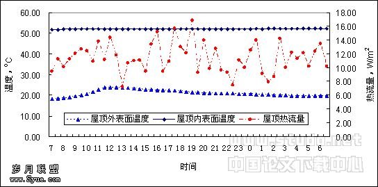 在本测试过程中,为了计算屋顶的传热系数,主要对屋顶外表面温度、屋顶内表面温度和屋顶热流量进行了现场实测,具体实测结果如图2所示。