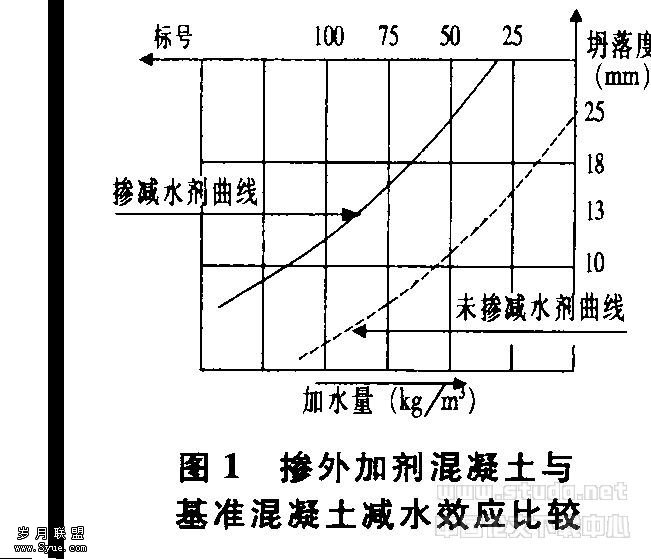在本工程中,地下室底板使用KFDN-SP8外加剂,看台楼层等混凝土根据具体情况,选用HPM一2高效缓凝减水剂、FE—C2外加剂等,这些高效外加剂具有高减水率和良好的保塑性能。掺外加剂混凝土与基准混凝土的减水效应比较如图1所示。