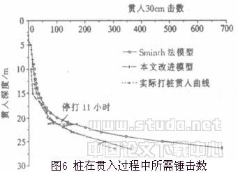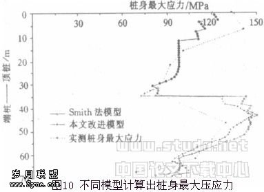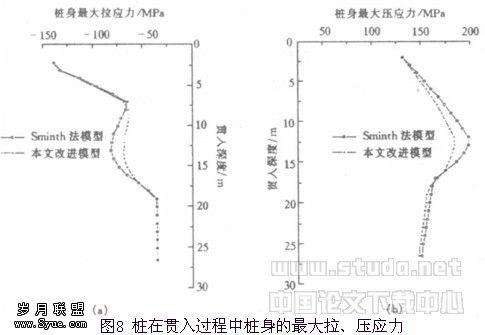 由图8分析,随着贯入深度增加,桩身的最大拉应力反而减小。在泥面附近贯入深度处,拉应力值最大,两模型的计算值均约为139.0MPa。故在沉桩初期(特别对于混凝土桩),应尽量采取措施减少锤击能量(如轻锤,或重锤小落距),以减小锤击拉应力值,防止桩身拉裂。在整个沉桩过程中,两模型得到的最大压应力值变化趋势非常一致,即先增加后减小,但本文改进模型所得到的最大压应力值略小于Smith法模型的相应值,在最大贯入深度一半处,两模型的最大压应力值都达到最大,分别为:183.2MPa、197.6MPa。钢管桩的屈服强度Fy为360MPa,显然在沉桩过程中桩不会发生柱状屈曲,即满足强度要求。