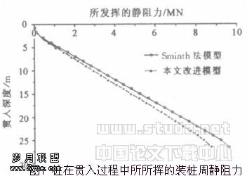 由图7分析,随着贯入深度增加,发挥的桩周静阻力基本线性增加,这与计算中假定的桩侧土体均匀分布有关。本文改进模型计算值略小于Smith法模型的相应值,在最大贯入深度处所发挥的桩周静阻力分别为:9.6MN和8.699MN。