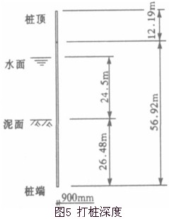 4.1 工程介绍 某海洋石油平台地区水深24.5m,潮差1.0~1.5m。从地质资料由上而下基本可分5层(表1),土质不均匀,夹层较多,表面有较厚的淤泥层在覆盖。平台桩基试桩为钢管桩,贯入深度0~16.1m范围内用M40型柴油锤打桩,在贯入深度16.1~26.48m范围内采用MB70型柴油锤施工。该桩总长为69.11m,整个桩打入到设计贯入深度26.48m,即桩端持力层位于第⑤层——粉细砂层,如图5所示。桩身壁厚变化,即δ=14~36mm。